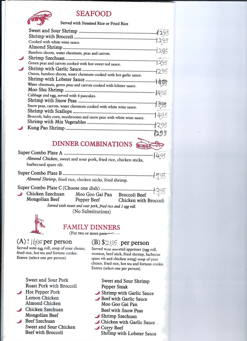 Almond Shrimp (white wine sauce OR brown sauce), fried rice, chicken wings (2), fried shrimp (4).